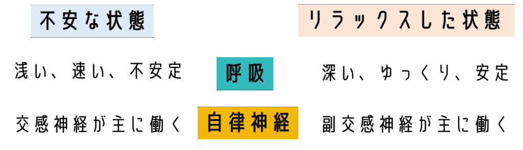 - 呼吸を整えることで、自律神経(交感神経と副交感神経)のバランスが整い、心と体が落ち着く。